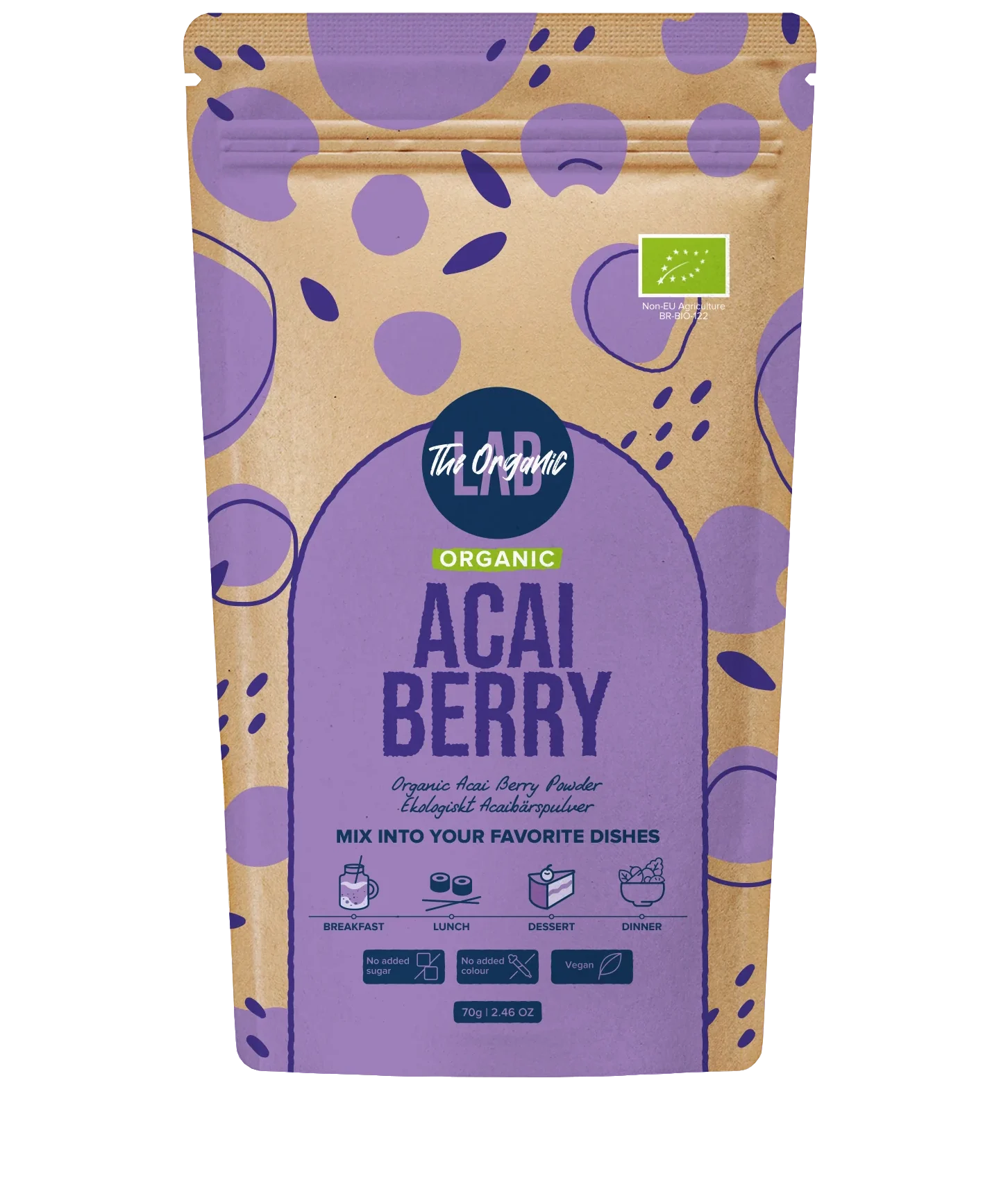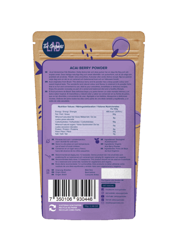 Organski acai prah je fino mljeni, tamnoljubičasti prah napravljen od liofiliziranih acai bobica, supervoća porijeklom iz amazonske prašume.