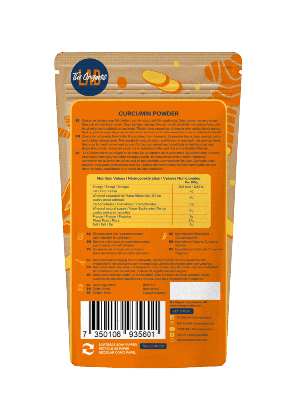 Organski kurkumin u prahu je jarko žuto-narančasti prah dobiven iz korijena biljke kurkume (Curcuma longa).