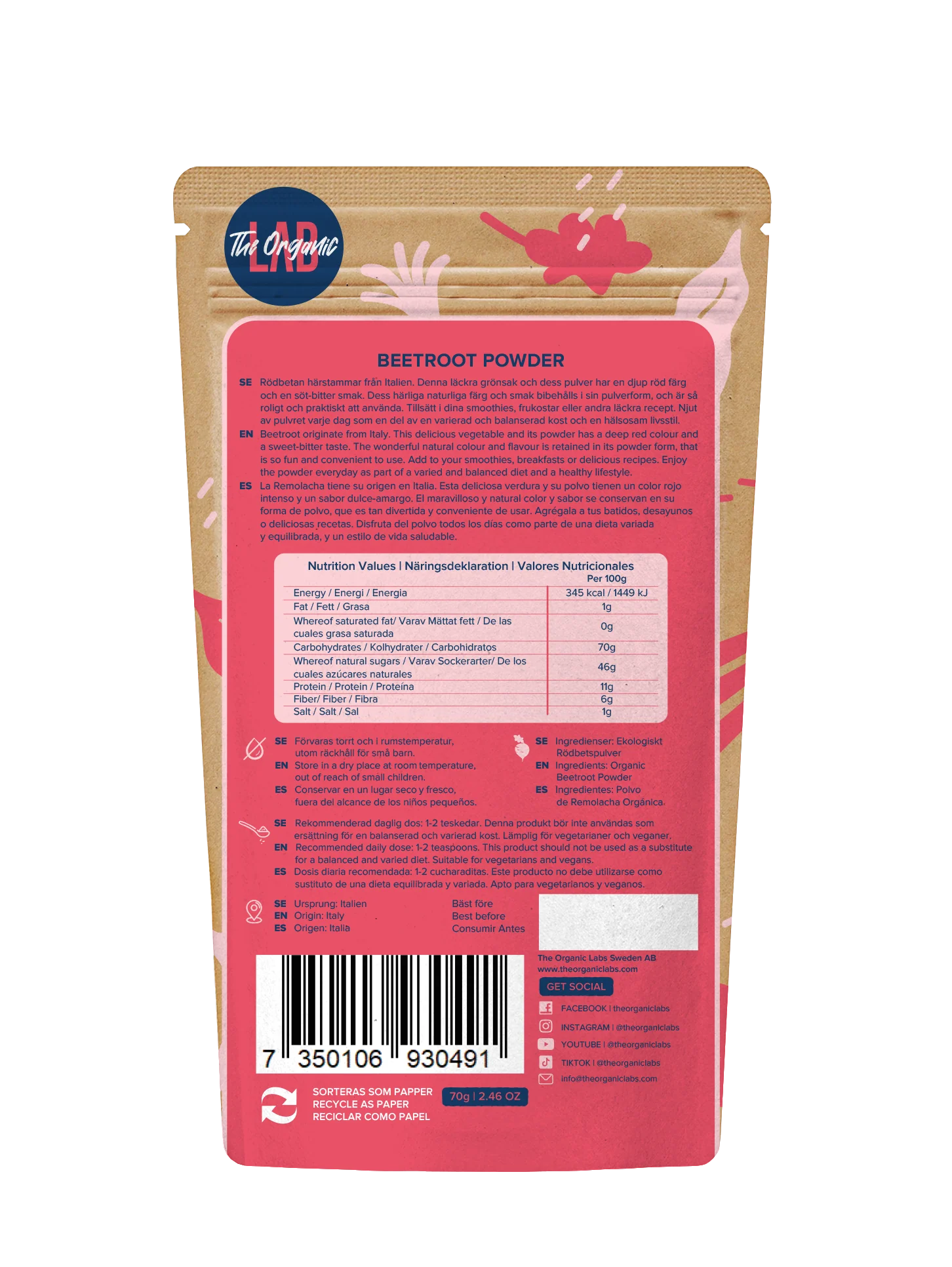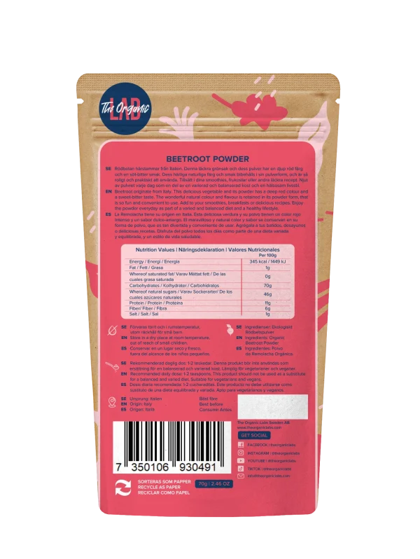 Poznat po svom prirodno slatkom i zemljanom okusu, ovaj prah je izvrstan način da svojim kulinarskim kreacijama dodaš boju i bogat okus. Bez obzira poboljšavaš li boju smoothija, peciva ili umaka, prah cikle pruža i vizualnu privlačnost i okus. Također se često koristi kao prirodna boja za hranu, pružajući zdravu i prirodnu alternativu sintetičkim bojama.