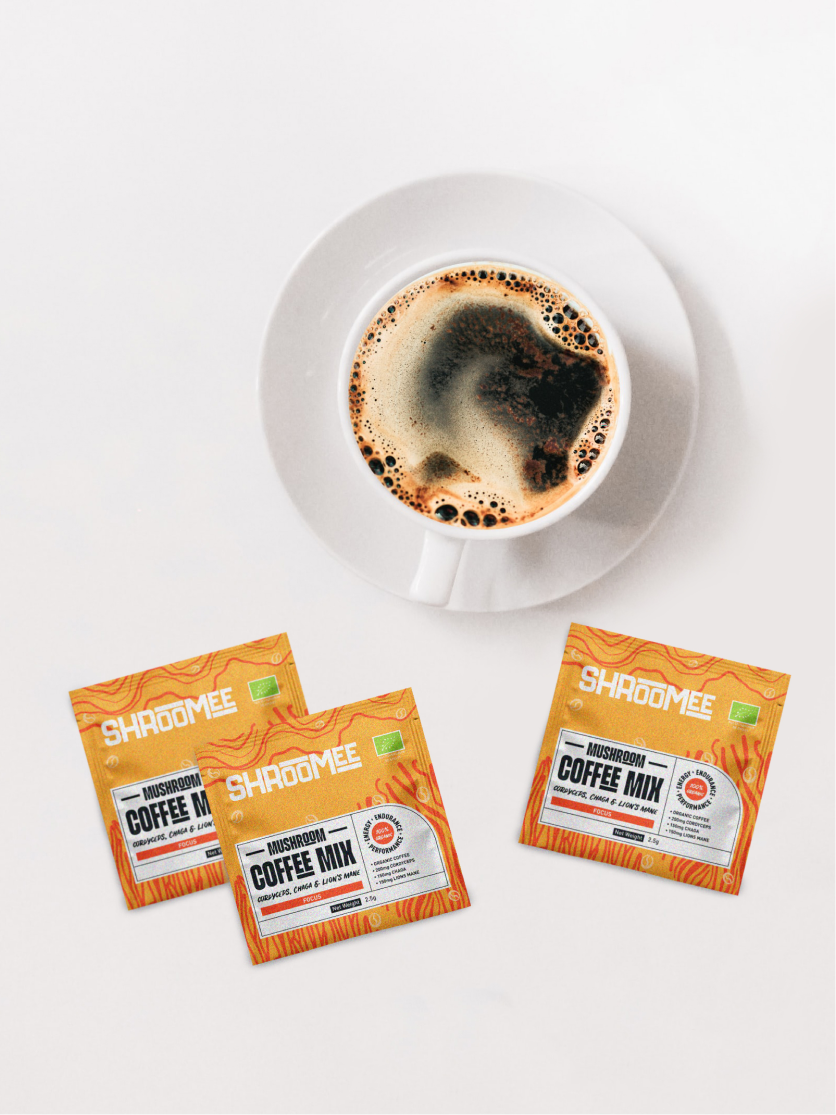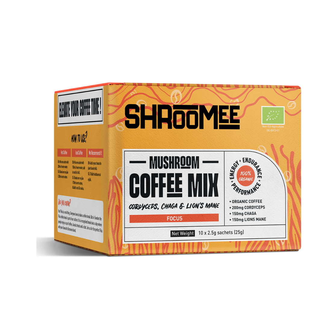 Započnite dan mirno i stabilno s bogatom organskom instant kavom, pomiješanom s Kordicepsom, Lavljom grivom i Chagom.