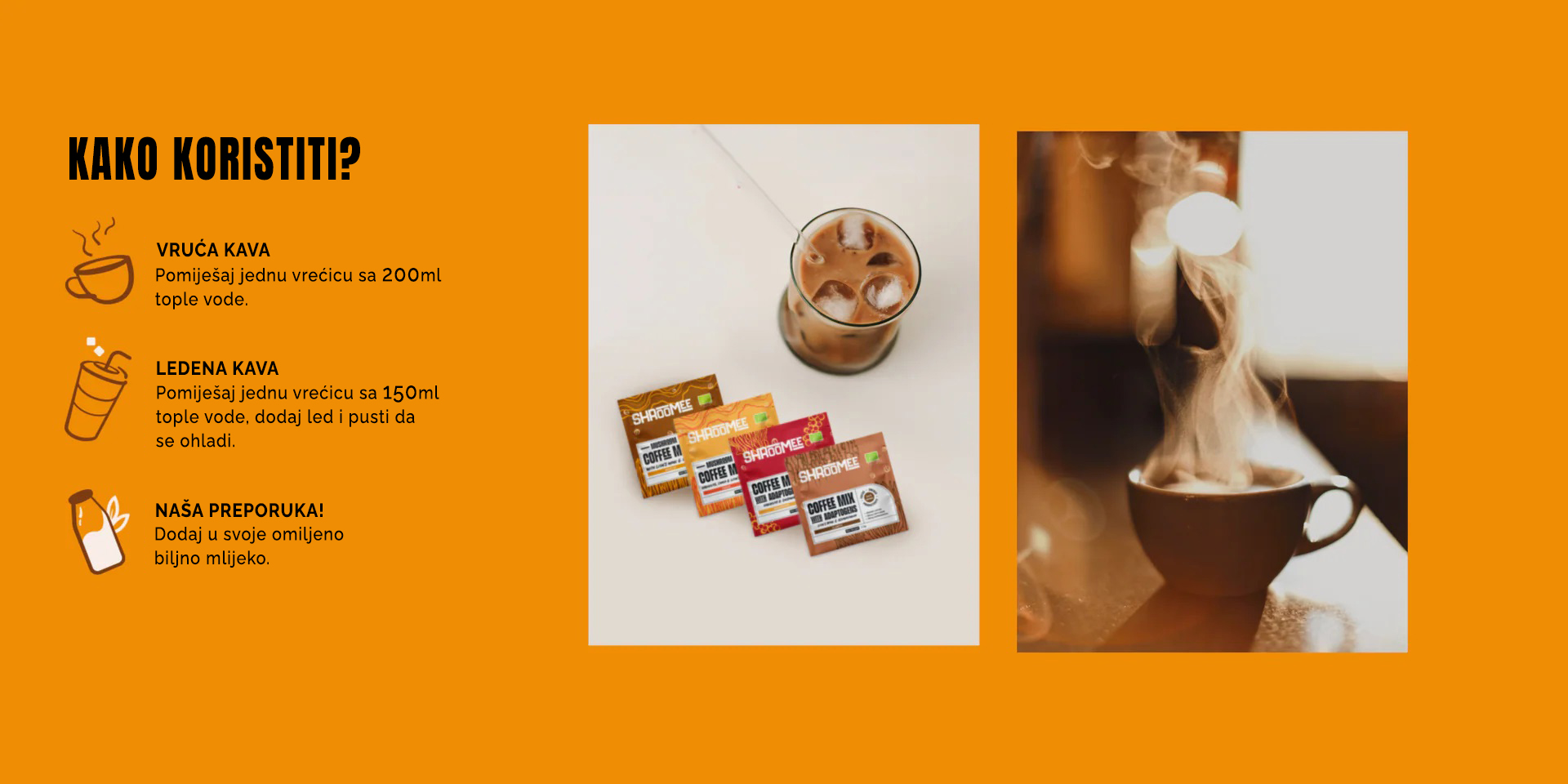 Vruće: pomiješaj jednu vrećicu s 200 ml vruće vode i dodaj malo mlijeka. Ako voliš više mlijeka, pomiješaj s 50ml vruće vode pa dodaj min. 100ml mlijeka.